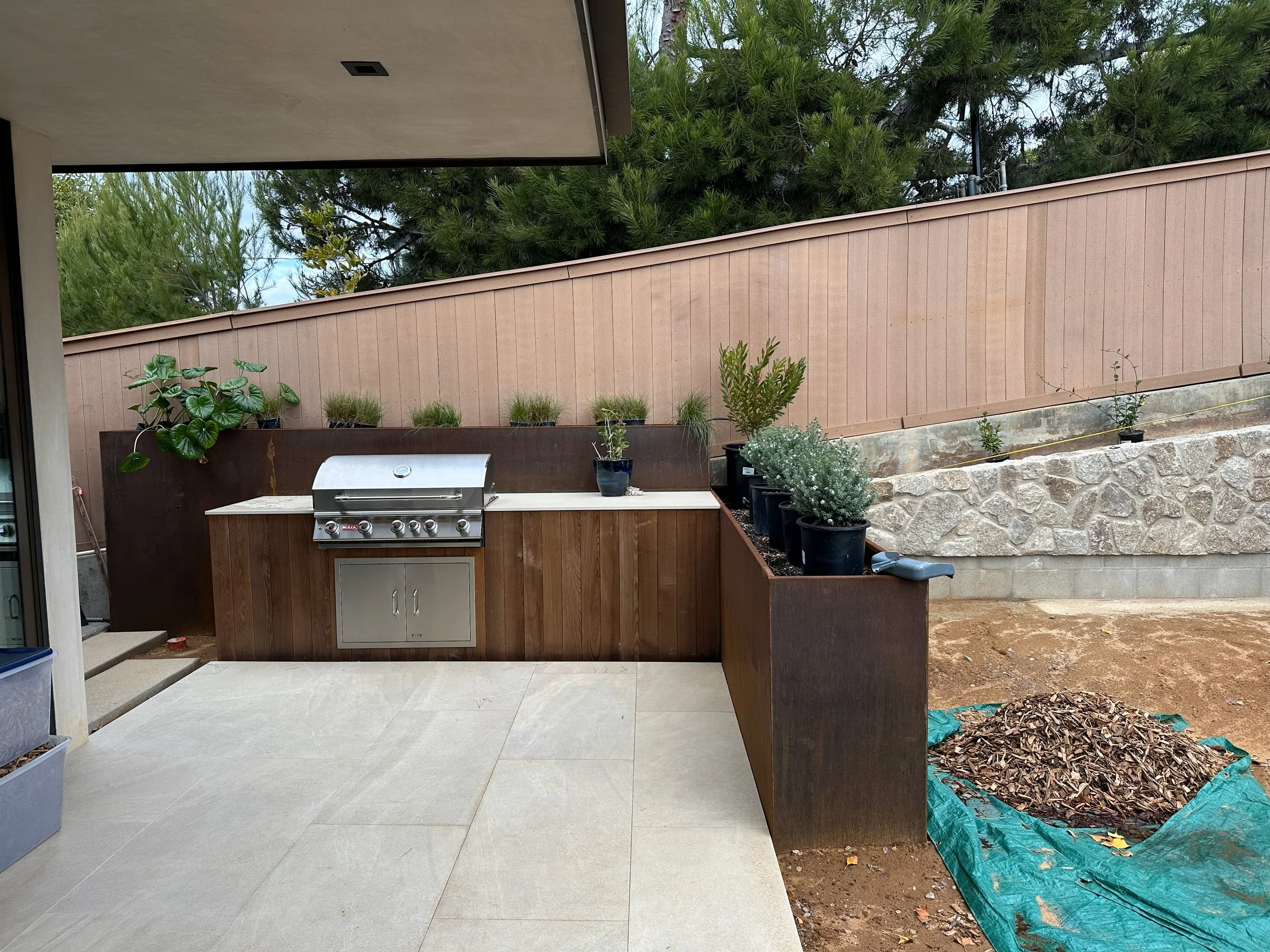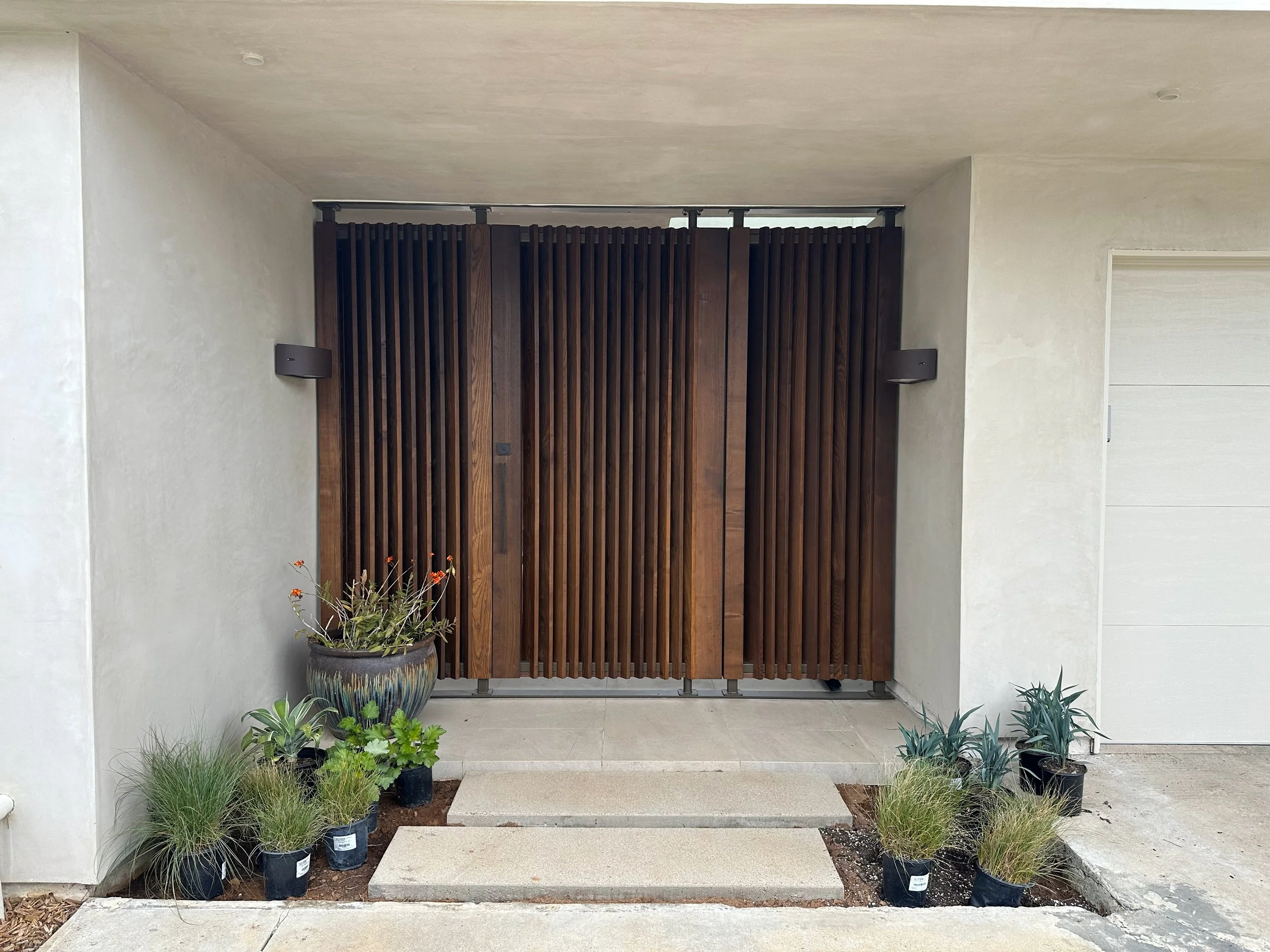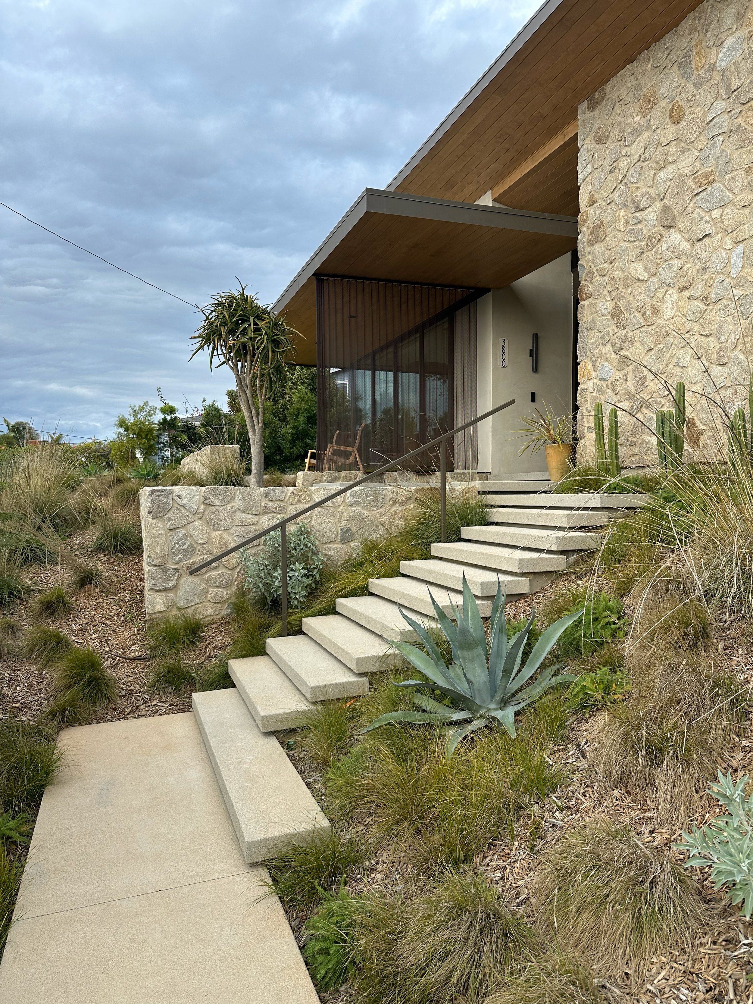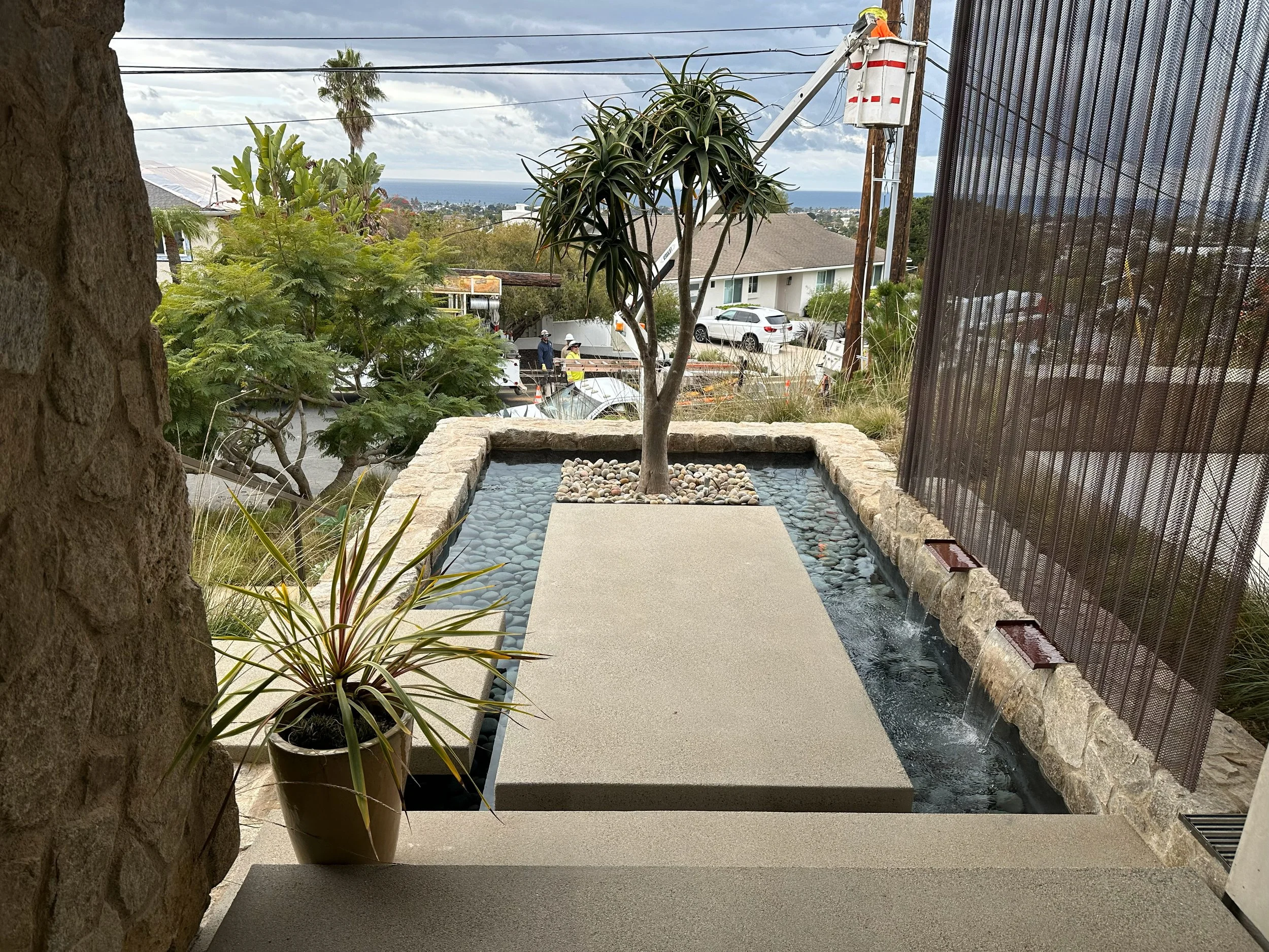 A contemporary hillside remodel overlooking the Pacific Ocean, this project choreographs arrival as a spatial and sensory experience. Floating stairs ascend the steep terrain, guiding guests through a landscape of native and adaptive plantings that honor the region’s chaparral ecology while thoughtfully preserving the spirit of the home’s original Japanese garden. At the summit, a slender bridge crosses a reflective water feature, creating a moment of pause before entry. Within the home’s courtyard, a hidden garden is revealed, anchored by graceful Ginkgo trees and complemented by a custom outdoor kitchen and a built-in hot tub, offering an intimate retreat that balances modern living with quiet reverence for landscape and place.