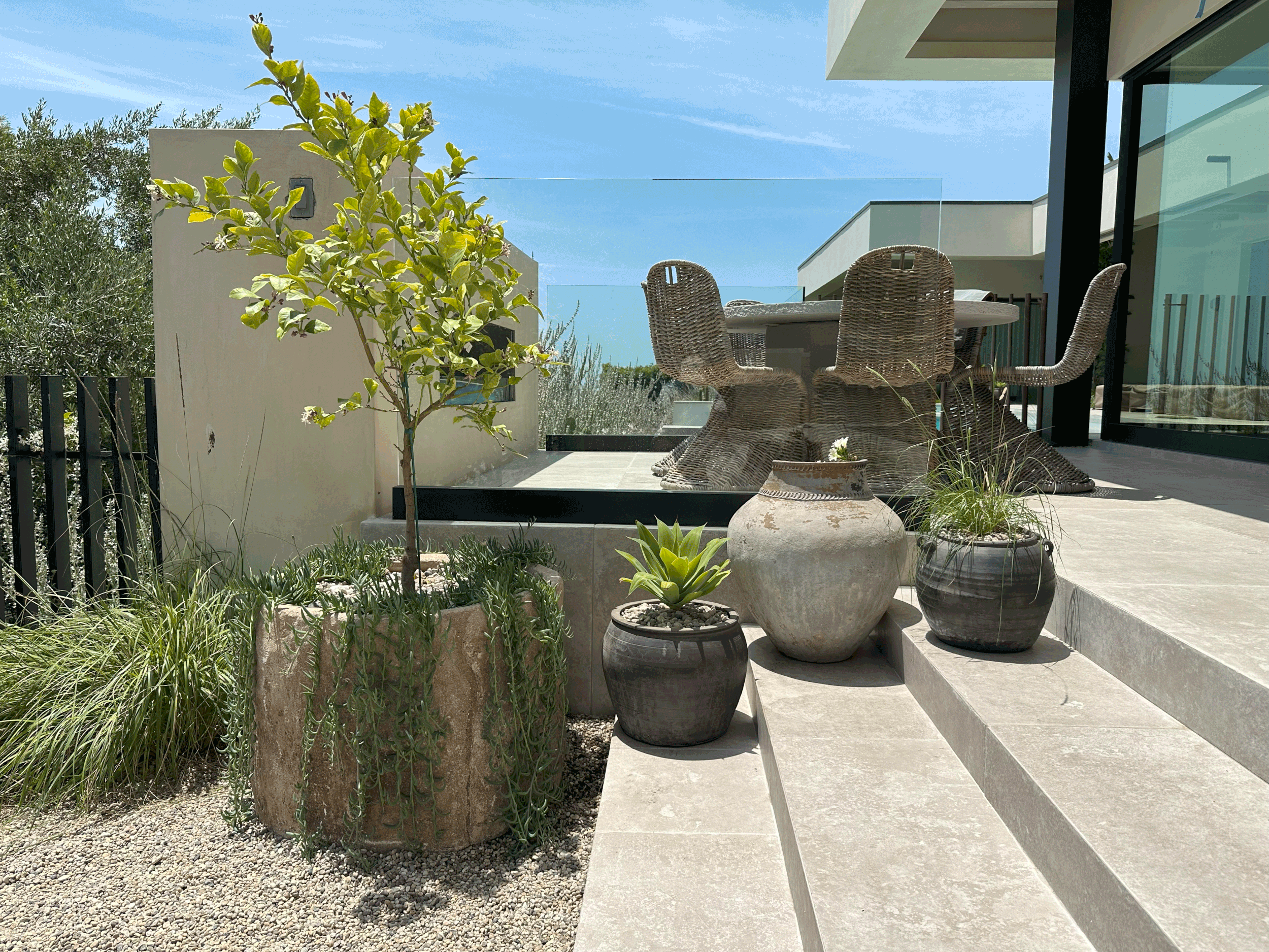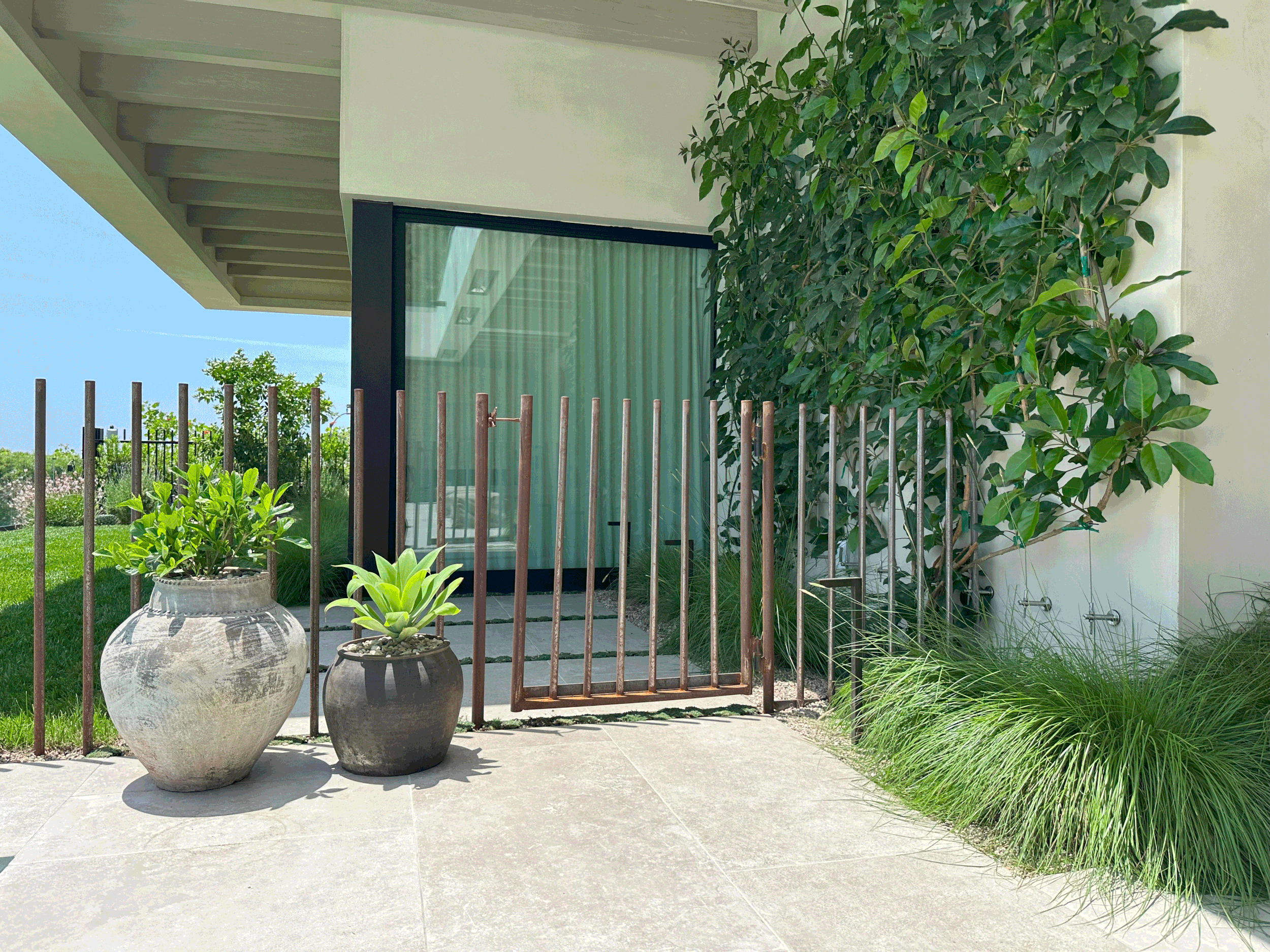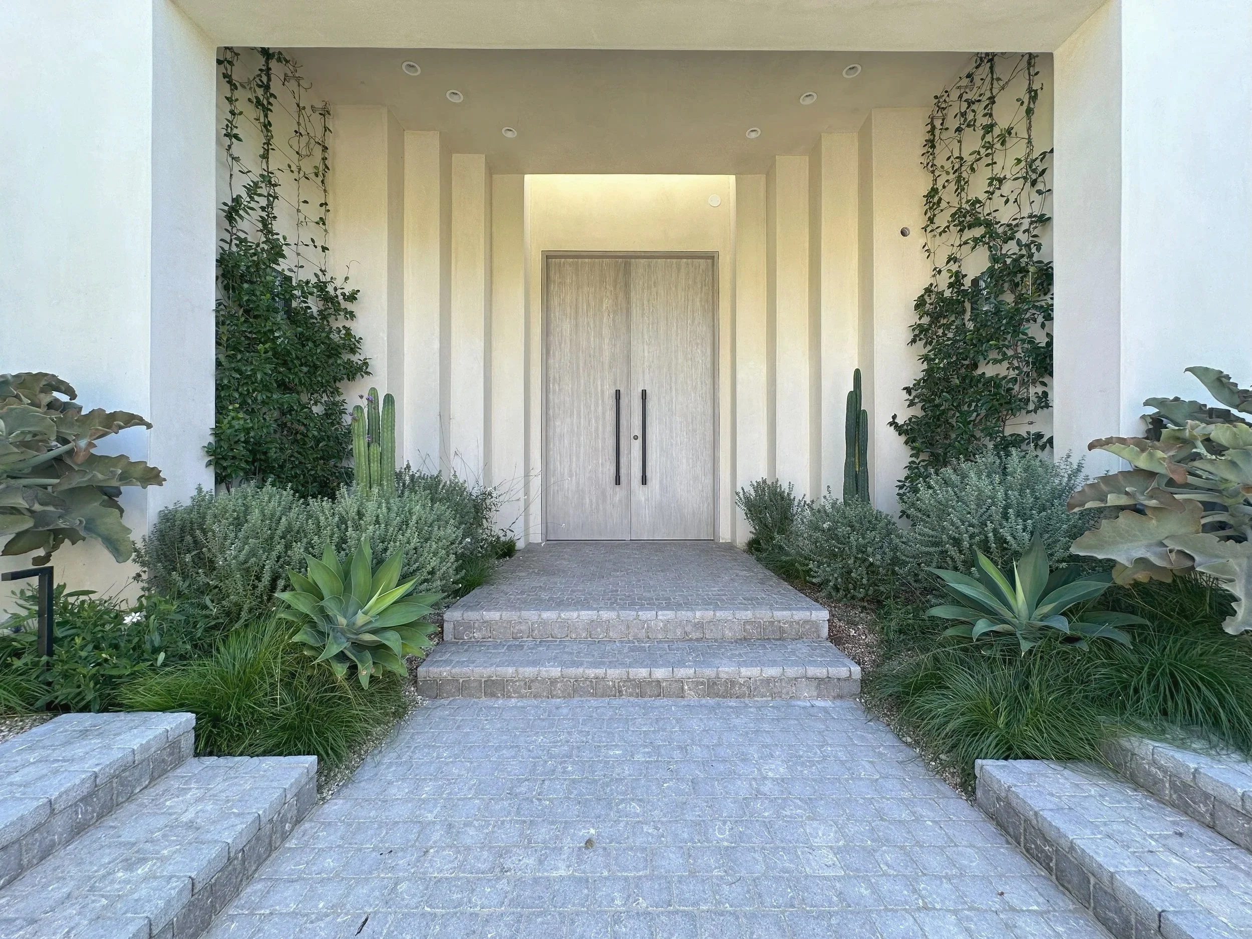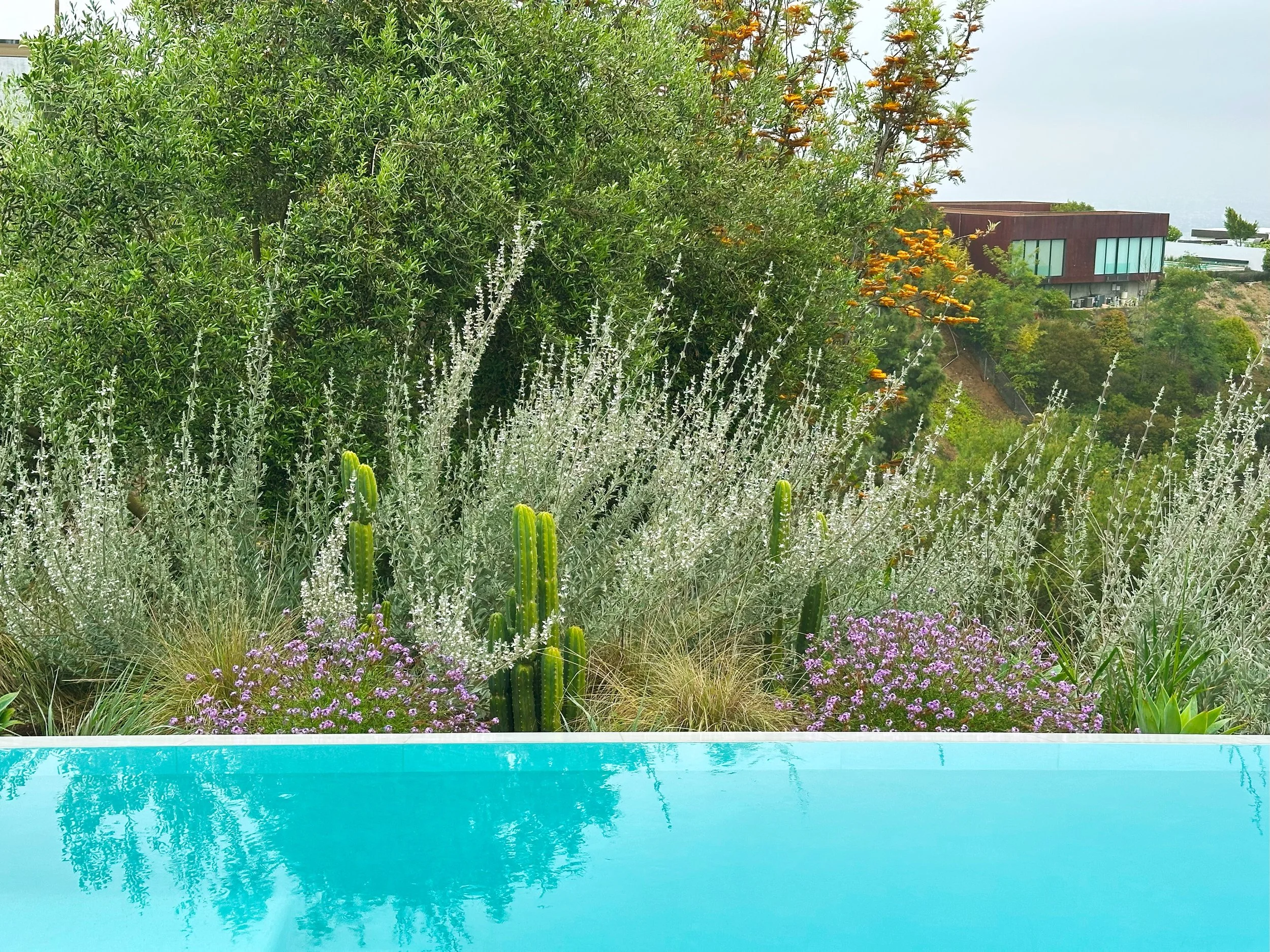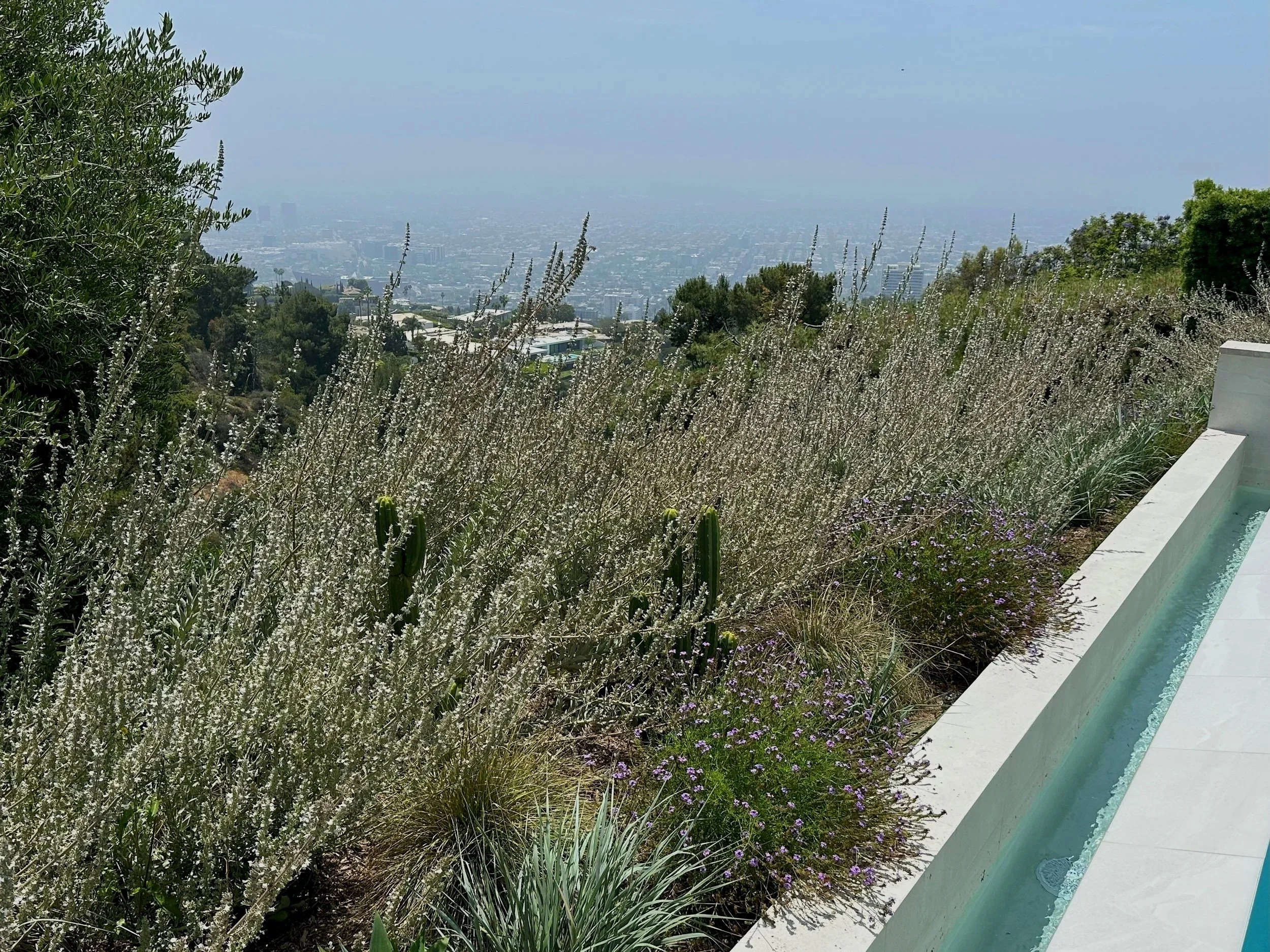 Hillside residences present a unique set of design challenges that require thoughtful, strategic solutions—and the Beverly Hills residence was no exception. Following the purchase of the property, the clients immediately enlisted UPON to address several pressing issues: a dense tangle of exotic, water-thirsty plants; large expanses of impervious concrete paving; and unstable slopes in need of erosion control. The clients envisioned a private Mediterranean garden enveloping the home, with space carved out for a small lawn and an intimate entertaining area—no small feat given the limited buildable area and steep rear slope. UPON responded with a design that balanced aesthetics and function, integrating erosion control strategies and reimagining the outdoor spaces. To guide guests through the home and toward the panoramic views beyond, UPON crafted a refined entry sequence that culminates at the pool deck. A custom privacy fence, pool fence, and a productive culinary garden were also incorporated into the comprehensive site plan, creating a cohesive and inviting hillside retreat.