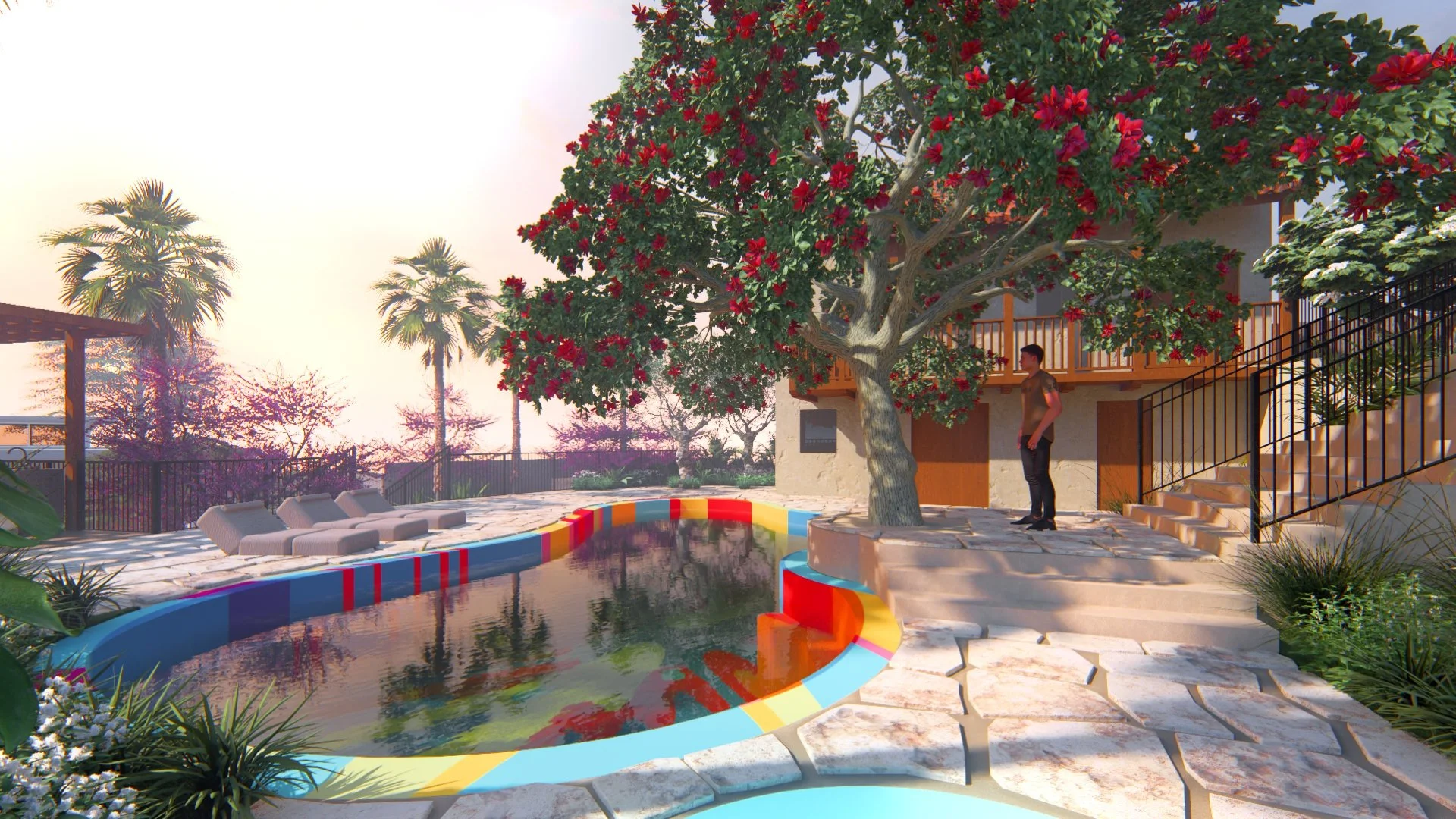A secluded retreat in the Hollywood Hills, this project offers a deliberate escape from the intensity of the world beyond, dissolving boundaries between landscape, architecture, and art. Entering from Mulholland Drive, a concealed portal through a privacy hedge draws visitors past reflective water features and into an interactive sequence where the house and landscape unfold as one. Beyond the rear of the property, guests are guided through a curated artistic journey, anchored by Jacob Hopkins’ sculptural fire feature and counterbalanced by a layered onyx stone water installation. On the second terrace, a mythical tree canopy presides over a pop-art tiled pool created by artist Kii Arens. Along the stair, within an opening known as the Thought Forest, a human-scaled kaleidoscope is discovered inside a birdhouse, an unexpected collaboration between UPON and artist Chris Holms, inviting reflection, wonder, and play.