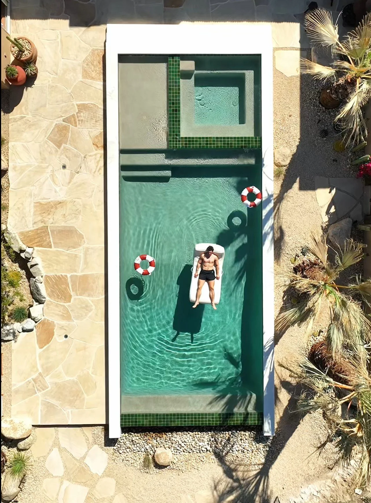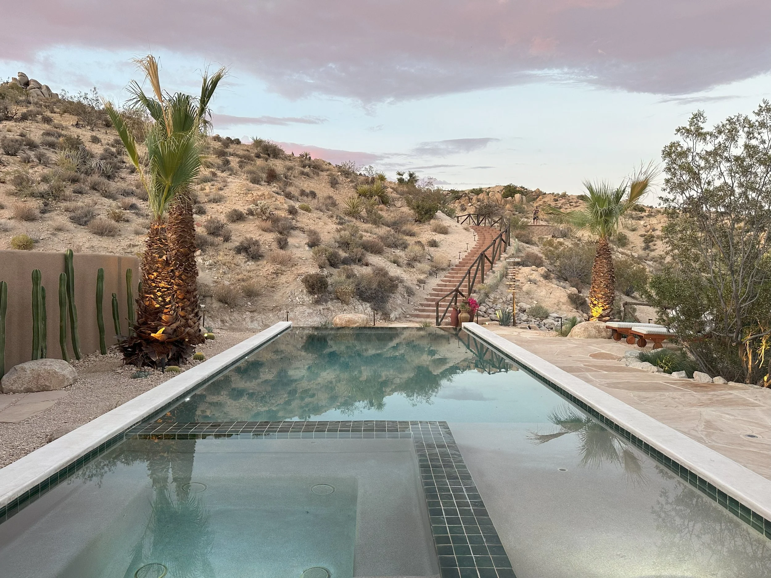 Nestled in Yucca Valley, Saguaro Ridge Retreat offers an inviting escape for both leisurely getaways and corporate retreats. Drawing inspiration from the stunning desert landscape and expansive vistas, UPON transformed the estate into a tranquil oasis. The vivid green tile and crisp white stucco of the pool frame the reflection of the swaying palms and drifting clouds above, creating a serene visual experience. Pathways of local flagstone guide guests from the main residence to a range of thoughtfully integrated amenities, including a meditative labyrinth, shaded hammocks, a yoga and stargazing deck, bocce courts, and scenic nature trails. A carefully selected palette of native plants conserves water while casting dappled patterns of shade, seamlessly blending sustainability with beauty.