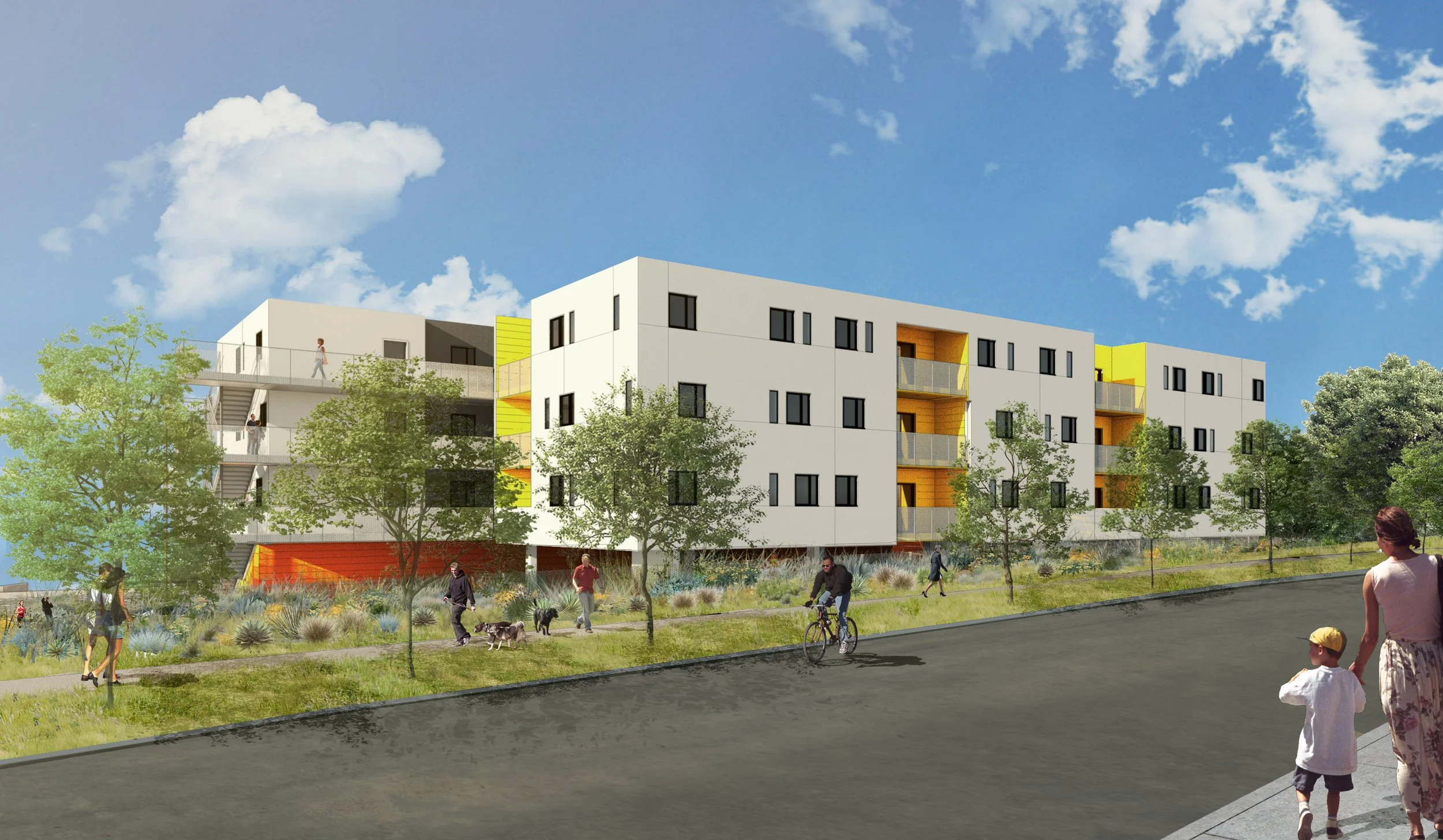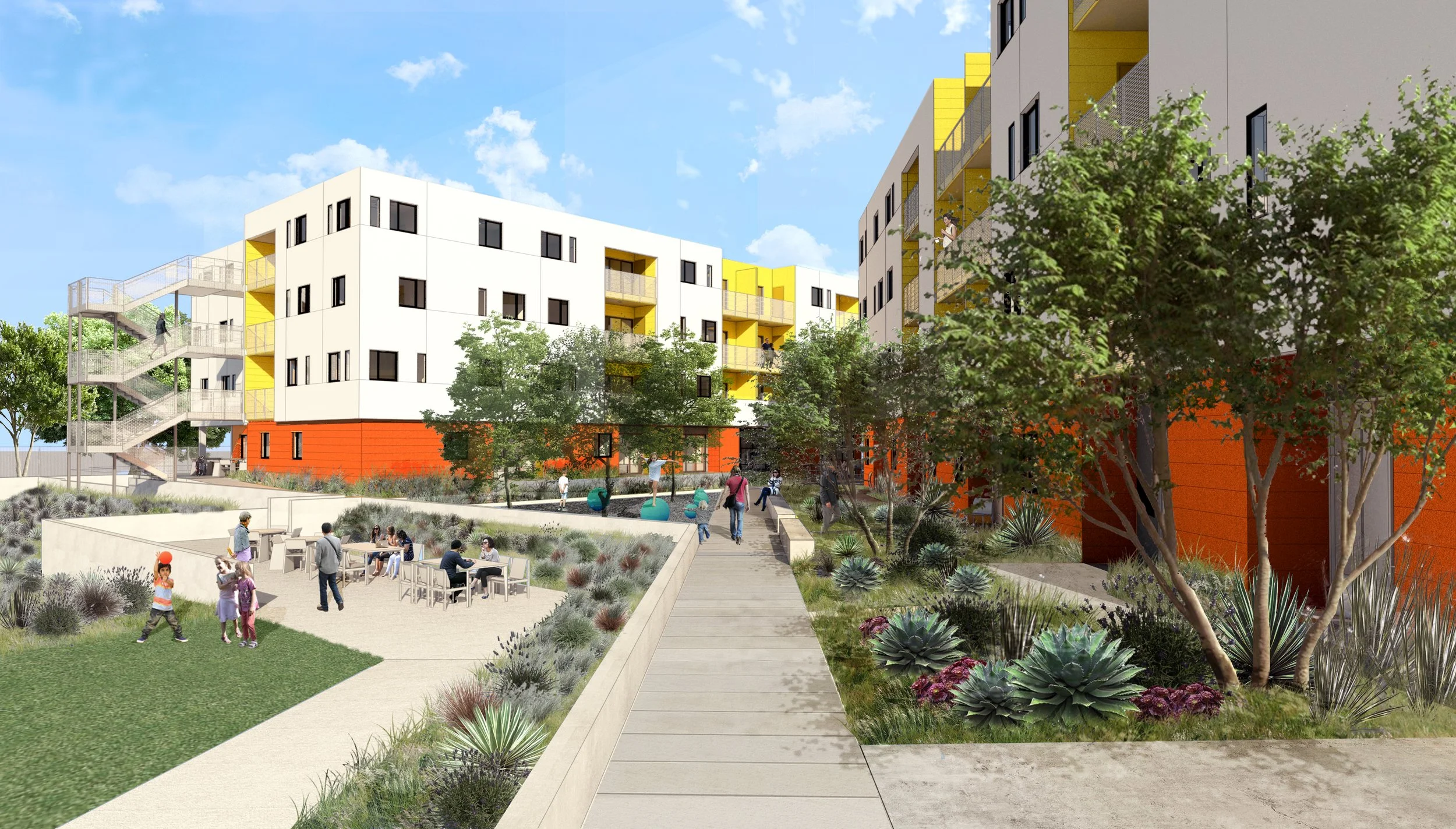 Keeler Court includes two 4-story buildings connected with exterior bridges. The design assist the minimization of solar heat gain to the units, allows views, and promotes natural ventilation. The design is registered for Green Point Certification. The exterior focused on connecting residents to the natural environment (a request repeated during user group interviews and community outreach meetings). A native plant pallet was established on site with areas for various programming including nature play, shaded gathering areas, semi-private seating areas, dark sky rated security lighting, a community garden, and dog relief area. Stormwater is collected in large cisterns beneath the exposed parking areas and treated on site through bioretention and algae filters.
