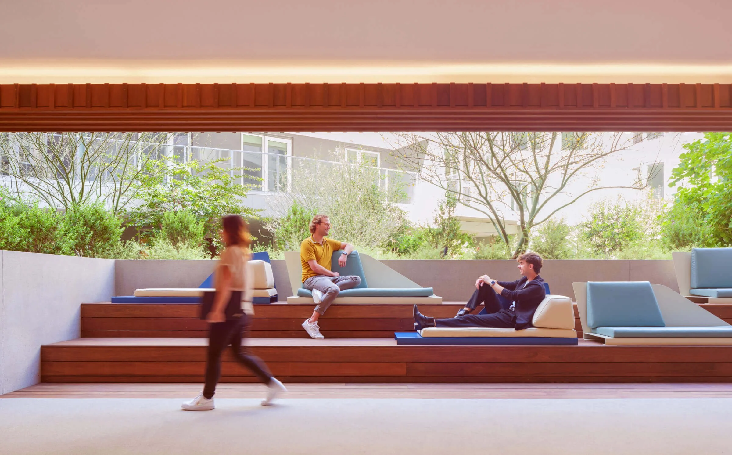 The plaza amplifies the strong indoor-outdoor connections that are at the heart of the Southern Californian lifestyle, especially in West LA. Built-in exterior benches offer shaded areas to gather, relax, and take in all the lively complex has to offer.