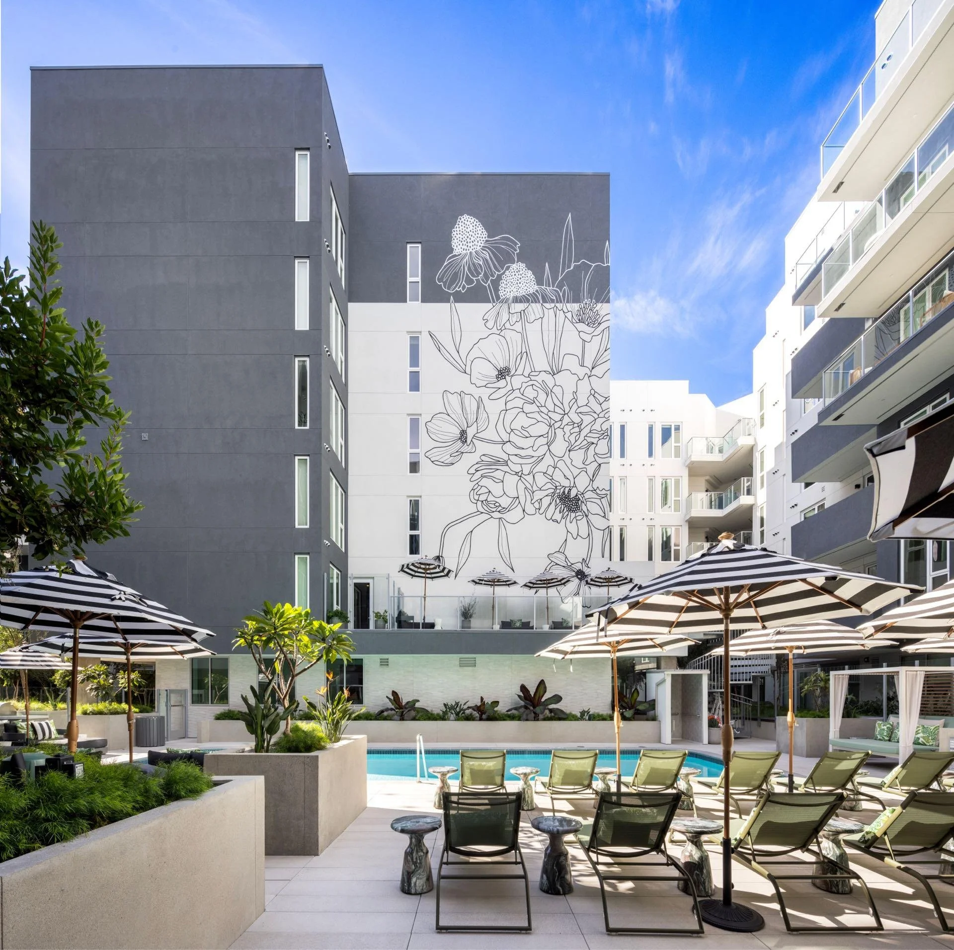 A paseo with green space and additional seating cuts diagonally through the property, extending community spaces and connecting the site to the surrounding urban environment. Situated at the busy intersection of Olympic Boulevard and Bundy Drive, the transit-oriented development provides a dynamic open space for all to live, work, and play.